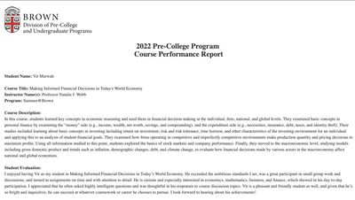 In the summer of 2022, I attended a summer school at Brown University, where I took the course "Making Informed Financial Decisions in Today's World Economy." The experience was incredibly enriching, both educationally and socially. Academically, the course deepened